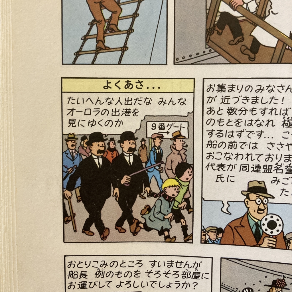 すると、突然「クックとプッケがいるよ!!」と、とあるコマを指して叫んだ。タンタンが乗るオーロラ号の出港を見送る人たちのシーンに、クックとプッケが...。びっくり!子どもに言われなかったら、気づかなかった。調べてみると、他のタンタンの本にも登場しているのだとか。おもしろーい。