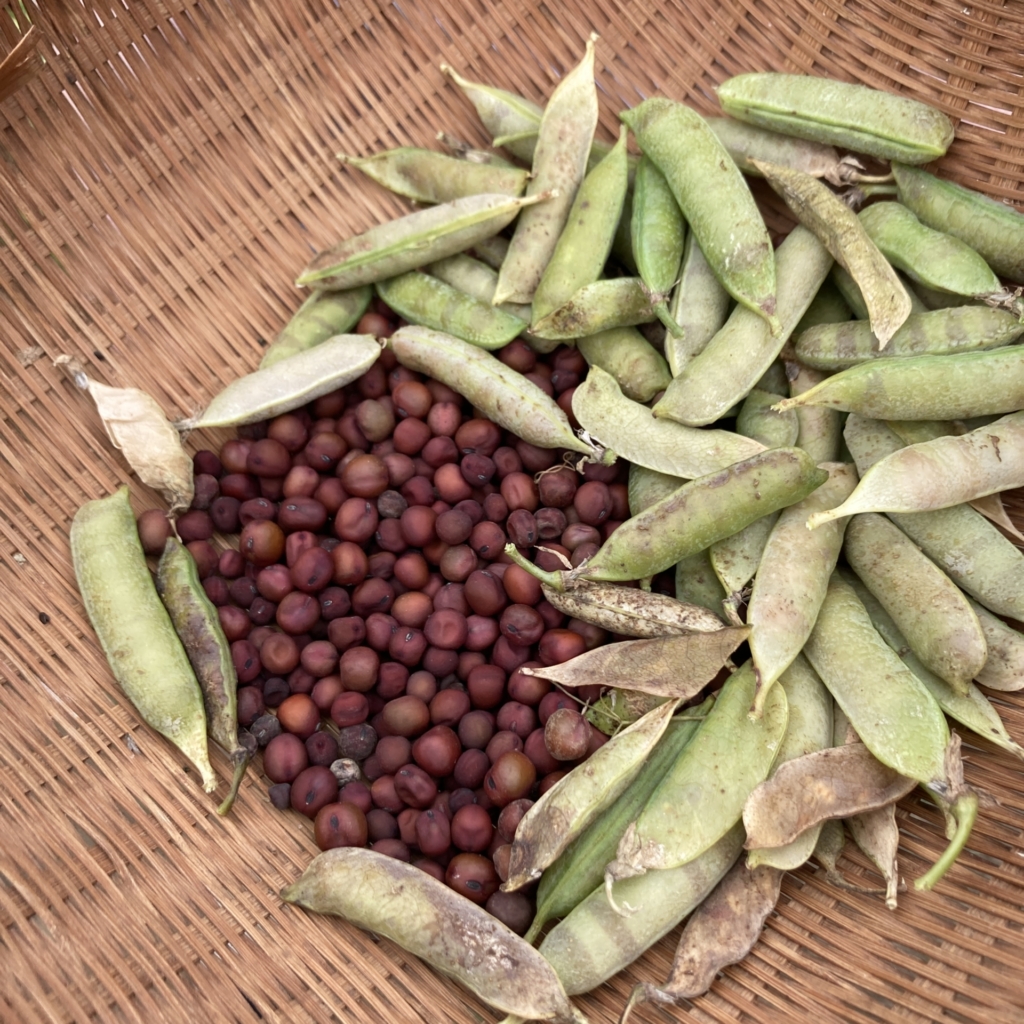 昨年の秋頃、岡山で畑をやっている従姉妹からもらったみつ豆(赤えんどう豆)を畑にパラパラとまいて、ほったらかしにしていたものを、5月に収穫。虫もつかず、簡単にできた。